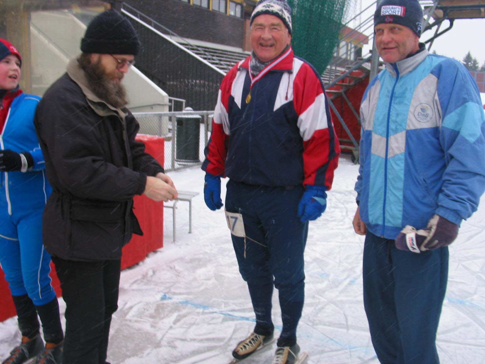 Bilde 5 av 6: Kjetil Narum Bakken overrekker medaljer for 20 fullførte skøytemiler til Thor Bryn og Vidar Svendsen. Tilskuer: Vetle Markussen.